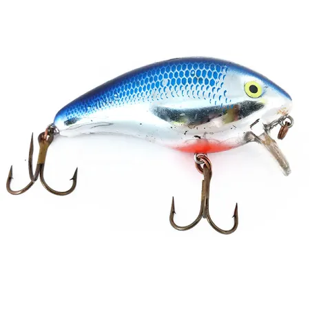 Den glittrande Chrome Blue Back-finishen på detta exemplar på 28 g (1 oz) ger hög synlighet vid fiske i grunt vatten. Denna Mann's 1-Minus, med produktkod 11027, är konstruerad för att arbeta på ett grunt djup av 0,5 m (1,6 ft), vilket möjliggör effektivt spinnfiske eller trolling över struktur. Den 8 cm (3 1/4") långa flytande kroppen har ett internt rasselkylsystem för att generera ljud i vattnet. Dess skick är klassat som 5/5, med en ren reflekterande yta och livfulla blå fjäll över ryggpartiet. Designen har en klar, kort dyksked och en tydlig oröd-orange fläck på strupen, tillsammans med två originalbronserade trekrokar. Detta bete från Mann's Bait Company kommer från USA och är ett standardval för gädda, abborre och asp. De gula ögonen med svarta pupiller fungerar som en tydlig fokuspunkt på kromhuvudet, vilket är karaktäristiskt för märkets vintage-estetik.