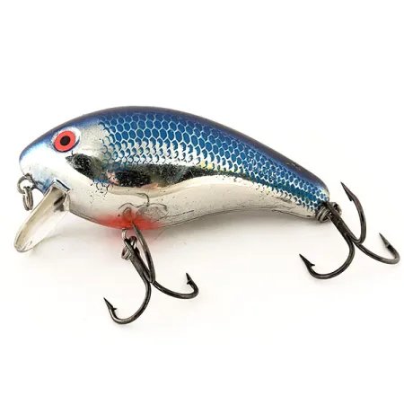Ett intensivt rött öga kontrasterar mot den kromade finishen med blått fjällmönster på denna 28 g (1 oz) shallow runner. Tillverkad av Mann's Bait Company i USA med produktkod 13084, mäter detta exemplar 8 cm (3 1/4") och är avsett för spinnfiske eller trolling i situationer som kräver en grund presentation. Färgsättningen Nickel Blue Back har en reflekterande krombuk med en röd fläck vid strupen och ett strukturerat blått fjällmönster längs ryggen. Denna rasslande, flytande modell är designad för att nå ett maximalt djup på 0,5 m (1,5 ft), vilket gör den idealisk för gädda, abborre och asp. Bestyckningen består av två mörka trekrokar. Trots mindre färgsläpp på huvudet och nära skeden bibehåller den strukturella integriteten och finishen ett gott skick på 4/5.