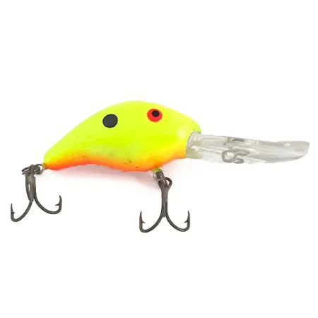 En livlig Yellow and Orange finish täcker denna kompakta kropp på 5 cm (2"), vilket gör den till ett val med hög synlighet för grumligt vatten. Denna Mann's Bait Company 10+ crankbait, identifierad med produktkod 6754, är en klassisk USA-tillverkad djupgående wobbler som väger 10 g (1/3 oz). Designad för att nå djup på upp till 3 m (10 ft), är dess stora klara sked en signaturfunktion för både spinnfiske och trolling. Mann's har länge varit respekterat för dessa specifika djupgående beten i "Plus"-serien, som är konstruerade för jämn invevning eller stop-and-go-presentationer. Vid en närmare granskning av exemplaret är färgen fortfarande skarp och livlig, vilket ger ett skickbetyg på 5/5. Betet har de karakteristiska stora svart-röda "target"-ögonen på sidorna, parade med original trekrokar i mörk finish. Övergången från den ljusa chartreuse-ryggen till den orangea magen ger en skarp kontrast mot den klara skeden.
