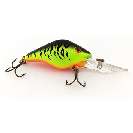 Denna djupgående wobbler i klassiskt Fire Tiger-mönster har en livlig chartreuse-färgad kropp med skarpa svarta tigerränder och en iögonfallande orange strupe. Med en vikt på 14 g (1/2 oz) och en längd på 5,5 cm (2 1/4") är Mann's Bait 30+ Depth Plus (Produktkod: 11737) ett specialiserat verktyg för att nå fisk djupt nere i vattenpelaren. Detta exemplar är i utmärkt skick, betygsatt 5/5 med klara orange ögon och en intakt finish. Den är flytande och designad för både kastfiske och trolling, med ett beräknat dykdjup på 5 m (16,4 ft). Tillverkad i USA, med en konstruktion som inkluderar en massiv klar dyksked och två original-trekkrokar. Just denna modell är framtagen för jämn hemtagning eller stop-and-go, vilket ger mångsidighet vid fiske i närheten av undervattensstrukturer.