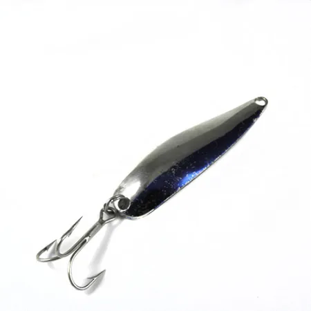 Med en lätt vikt på 8g (1/4oz) uppvisar den smala kroppen på detta amerikansktillverkade skeddrag en distinkt tvåfärgad estetik. Ena halvan av den konvexa sidan är avslutad i ljus, polerad nickel, medan den andra sidan är belagd med en djupblå metallicfärg med fina glitteraccenter. På baksidan finns namnet Marathon och ursprunget USA tydligt instämplat, tecken på redskapstillverkning från mitten av århundradet. Med en längd på 6cm (2 1/4") består hårdvaran av en klassisk trekrok ansluten med en pålitlig fjäderring. Skicket är solida 4/5, med en ren yta och vassa krokspetsar, vilket återspeglar noggrann förvaring under åren. Just denna 0387-modell är en stapelvara för dem som fiskar efter öring eller abborrfiskar där en mindre profil krävs.