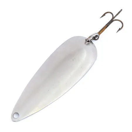 En polerad förnickling täcker den 7 cm (2 3/4") långa kroppen på detta vintage-skeddrag, som har varumärket Marathon stämplat på insidan. Med en vikt på 14 g (1/2 oz) är den droppformade profilen karakteristisk för de beten som tillverkades av Marathon Bait Company i Wisconsin under deras 50-åriga historia. Hårdvaran inkluderar en bronserad trekrok fäst via en robust fjäderring, med ett rent linhål i den avsmalnande änden för spinnfiske eller trolling. Detta exemplar har fått tillståndsgraden 5/5 och uppvisar en blank reflekterande yta samt bibehåller sin ursprungliga strukturella integritet. Detta USA-tillverkade bete med produktkod 10719 återspeglar de bruksorienterade designstandarder som var vanliga mellan 1929 och 1979.