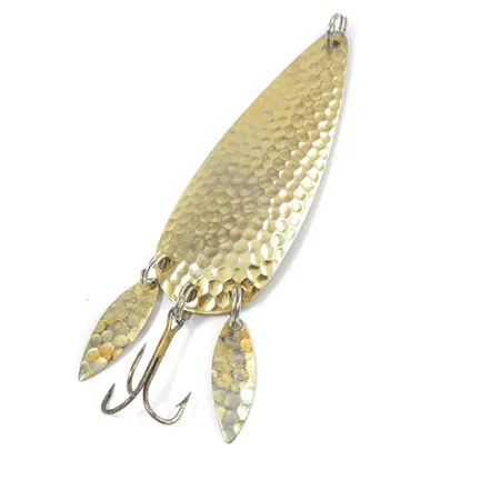 En hamrad guldstruktur definierar den droppformade kroppen på detta klassiska amerikanska skeddrag. Med två små "Sonic Blades" fästa vid stjärten tillsammans med trekroken, erbjuder Marathon 2 (produktkod 2080) en komplex profil för spinnfiske eller trolling. Marathon-företaget från USA byggde dessa med en solid mässingsbas, synlig på den släta baksidan. Draget väger 14g (1/2oz) och mäter 7cm (2 3/4"), och behåller en ljus, reflekterande finish över den hamrade ytan. Hårdvaran är fortsatt robust, inklusive fjäderringarna som håller de extra bladen. Detta exemplar är i skick 4/5, med mycket lätt ytslitage och mindre märken från förvaring.