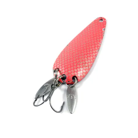 Den texturerade röda finishen med fjällmönster på detta skeddrag ger ett utseende med hög kontrast mot den polerade baksidan i nickel. Tillverkad av Marathon Bait Company i Wisconsin, verksamma mellan 1929 och 1979, visar detta 6 cm (2 1/4") exemplar med produktkod 3002 på märkets innovativa design. Med en vikt på 12 g (2/5 oz) är den förnicklade kroppen unikt riggad med två små, avlånga spinnarblad monterade på fjäderringarna intill trekroken. Dessa silverfärgade blad är placerade för att reflektera ljus, vilket effektivt döljer krokspetsen samtidigt som de efterliknar blänket från en betesfisks stjärtfena. Draget är i 4/5 skick och visar lätt slitage som bevarar dess historiska värde. Tydliga "Marathon"-stämplingar finns på baksidan av skeden och på de enskilda spinnarbladen.
