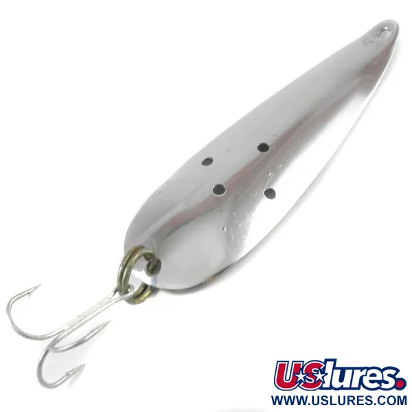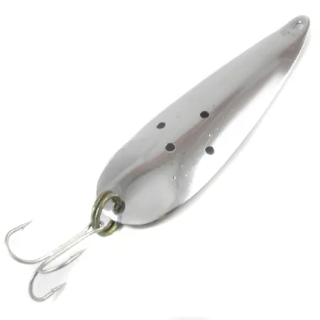 En polerad nickelfinish ger en högreflekterande yta på detta vintage skeddrag i metall, designat för kastfiske på djupt vatten eller trolling. Med en vikt på 18 g (2/3 oz) och en längd på 9,5 cm (3 3/4"), har kroppen fyra specifika perforeringar i mitten, ett unikt tekniskt val från Marathon Bait Company. Denna Wisconsin-baserade tillverkare var verksam från 1929 till 1979, och detta exemplar, listat under produktkod 3224, speglar den robusta amerikanska tillverkningen från den eran. Hårdvaran består av en kraftig fjäderring och en blank trekrok, som alla är i nyskick (5/5). Tillverkarens stämpel är tydligt synlig på dragets konkava sida, vilket bekräftar dess ursprung för samlare av klassiska fiskeredskap.