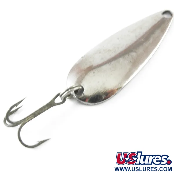 Namnet Marathon är tydligt stämplat på den konkava insidan och identifierar detta klassiska skeddrag som ett stycke fiskehistoria från Wisconsin och Marathon Bait Company. Med en vikt på 3/16 oz (5,5 g) och en längd på 1 3/4" (4,5 cm) är detta förnicklade bete ett mångsidigt val för lätt spinnfiske eller trolling. Detta exemplar, identifierat med produktkod 3716, visar upp den enkla men effektiva droppformade designen som företaget tillverkade mellan 1929 och 1979 i USA. Den reflekterande nickelytan förblir blank, och hårdvaran består av en robust trekrok som säkrats med en hållbar fjäderring vid basen. Klassat i skick 5/5, visar metallen en ren finish och bevarar den ursprungliga lystern från dess tillverkningsarv från mitten av århundradet. En liten, ren fästögla i den smala änden ger en säker punkt för ett beteslås eller direkt knut.
