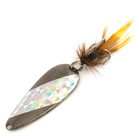 Med en vikt på exakt 1/4 oz (7 g) uppvisar detta droppformade skeddrag en mörkgrå metallisk finish som kontrasteras av ett iögonfallande holografiskt diamantmönstrat inlägg. Marathon Bait Company, verksamt i Wisconsin mellan 1929 och 1979, stämplade sitt namn tydligt på baksidan av den 1 3/4" (4,5 cm) långa kroppen. Draget, med produktkod 7529, är utrustat med en krok klädd med välbevarade bruna och gula fjädrar. Skicket är utmärkt, klassat som 5/5, vilket visar den prismatiska tejpens ursprungliga lyster. Detta USA-tillverkade exemplar har kvar sin originalmontering och fabrikstypade fjäderdress, vilket speglar tillverkningsstandarderna från sin tid.