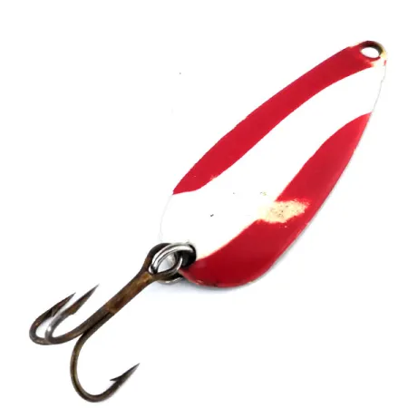 Diagonala röd- och vita emaljränder pryder framsidan av detta vintage skeddrag, en klassisk design tillverkad av Marathon Bait Company i Wisconsin mellan 1929 och 1979. Tydligt stämplad med varumärket på den förnicklade baksidan, representerar den 4,5 cm (1 3/4") långa metallkroppen en klassisk era av amerikansk sportfisketillverkning. Detta exemplar, identifierat med produktkod 9942, väger 7g (1/4oz) och har den traditionella droppformen som ofta används för både spinnfiske och trolling. Hårdvaran består av en robust trekrok fäst med en fjäderring, som uppvisar den mörka yta som är typisk för dess ålder. Graderad till 4/5 i skick, visar betet lätta färgsläpp på framsidan och mindre ytmärken på den reflekterande baksidan av nickel, men bibehåller ett mycket rent helhetsintryck. Kontrasten mellan det djärva målade mönstret och den blanka metallundersidan förblir skarp och väl definierad.