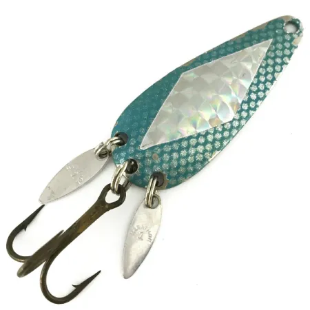 Detta skeddrag väger 12 g (2/5 oz) och har ett distinkt blått fjällmönster som omger en central holografisk diamantinsats. Draget finns i katalogen under produktkod 7111, mäter 6 cm (2 1/4 tum) och visar upp den unika designfilosofin hos Marathon Bait Company från Wausau, Wisconsin. Företaget tillverkade framgångsrikt fiskeredskap under femtio år mellan 1929 och 1979, och detta exemplar representerar deras specifika variant med två avlånga silverfärgade miniskedar fästa vid fjäderringen. Dessa ljudskedar är placerade bredvid trekroken för att fånga ljus och ge en visuell representation av en betesfiskstjärt. Medan framsidan är livfullt texturerad, är baksidan färdigställd i ren, polerad nickel. Marathon-namnet är tydligt stämplat på de små skedarna, vilket ger ett pålitligt äkthetsbevis för samlare. Ytan på framsidan är välbevarad och hårdvaran är fortfarande robust, vilket ger detta vintage-drag ett skickbetyg på 4/5. Det fungerar som ett gediget exempel på amerikansk tillverkning från mitten av seklet, och kombinerar en texturerad blågrön kropp med ljusreflekterande element för att locka till hugg vid kastfiske.
