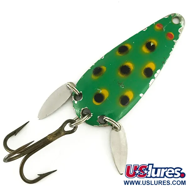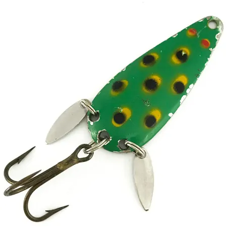Gröna och gula fläckar i ett traditionellt grodmönster pryder ovansidan av detta 6 cm (2 1/4") skeddrag. På den polerade nickelundersidan är namnet Marathon tydligt stämplat, en tillverkare som definierade Wisconsins fiskescen från sin bas i Wausau mellan 1929 och 1979. Vid stjärten på detta 12 g (2/5 oz) exemplar, identifierat med produktkod 7156, är två karaktäristiska silverfärgade soniska blad monterade på fjäderringen. Dessa långsmala miniblad är placerade för att reflektera ljus och dölja den mörkbehandlade trekroken under kast eller trolling. Detta exemplar är i rent skick med minimalt emaljslitage, vilket motiverar betyget 5/5.
