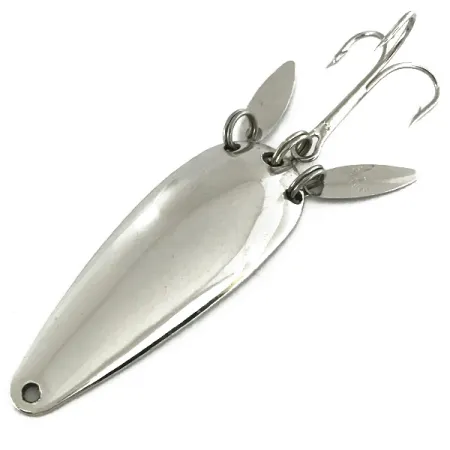Polerad förnickling täcker hela den 6 cm (2 1/4") långa kroppen på detta klassiska skeddrag, ett signum för det hantverk som Marathon Bait Company producerade under sin femtioåriga historia i Wisconsin. Betet väger 12 g (2/5 oz) och har en unik konstruktion där två små, droppformade soniska blad är fästa med fjäderringar nära kroken. Dessa extra blad har ett dubbelt syfte: de tillför extra blänk till profilen och döljer delvis den stora trekroken för att bättre efterlikna en flyende betesfisk. Denna specifika modell, med produktkod 7269, representerar den smarta ingenjörskonst som gjorde Marathon till en dominerande amerikansk tillverkare mellan 1929 och 1979. Skicket är en stabil 5/5, där metallytorna förblir blanka och de stämplade detaljerna är skarpa. Ett enda, rent borrat linhål i den smala änden fullbordar droppdesignen, avsedd för spinnfiske eller trolling i olika sötvattenmiljöer.