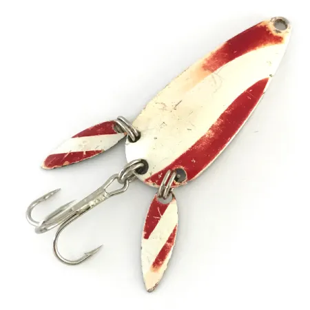 Diagonala röda och vita ränder ger ett högvisst mönster på framsidan av detta 4,5 cm (1 3/4") skeddrag. Inpräglat på den förnicklade undersidan finns varumärket Marathon, ett märke från det Wisconsin-baserade företaget som verkade mellan 1929 och 1979. Denna specifika modell har produktkod 8200 och kännetecknas av dubbla sonic-blad vid stjärten. Dessa två små, avlånga metallblad flimrar nära trekroken, vilket ger extra blänk och döljer krokens profil. Med en vikt på 8g (1/4oz) är draget balanserat för mångsidigt kastfiske. Skicket bedöms som 4/5, där färgen visar vissa lätta ålderstecken medan den underliggande nickelfinishen förblir blank. Säkert monterade komponenter håller de bakre bladen och trekroken på plats, vilket bevarar originalutförandet på detta USA-tillverkade fiskeredskap.