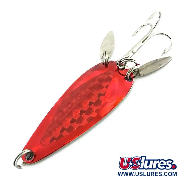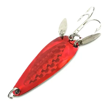 En livfull röd metallic-plätering täcker ytan på detta 6 cm (2 1/4") skeddrag, som har ett djupt strukturerat fjällmönster för att reflektera ljus. Draget väger 12 g (2/5 oz) och utmärker sig genom sina dubbla silverfärgade spinnarskedar monterade på de bakre fjäderringarna, vilka ger visuella reflexer och efterliknar rörelsen hos en betesfisks stjärt. Detta exemplar, med produktkod 8645, tillverkades av Marathon Bait Company i Wisconsin, en tillverkare som var verksam mellan 1929 och 1979. Komponenterna, inklusive den vassa trekroken och den främre fjäderringen, visar inga tecken på åldrande, vilket motiverar ett skickbetyg på 5/5. Dessa små spinnarskedar av willow-modell hjälper även till att delvis dölja kroken för skygg fisk. Den droppformade kroppen är något konkav för att förbättra vattenförflyttningen vid jämn invevning.