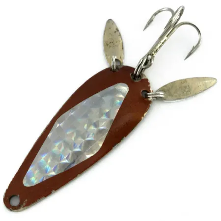 Brun emalj täcker framsidan av detta 6 cm (2 1/4") skeddrag, framhävt av ett centralt facetterat reflektormärke med diamantmönster som fångar ljus från flera vinklar. Detta exemplar speglar hantverket från mitten av århundradet hos Marathon Bait Company, en ikon i Wisconsin som var verksam från 1929 till 1979. Med en vikt på 12 g (2/5 oz) har draget en karakteristisk «sonic blade»-design där två små, ovala metallskedar är fästa i fjäderringar precis ovanför trekroken för att ge extra blänk. På baksidan är den rena nickelfinishen tydligt stämplad med namnet «MARATHON», vilket bekräftar dess ursprung under produktkod 9478. Draget är i skick 5/5 och visar mycket få tecken på sin ålder, då den bruna färgen förblir levande och metallkomponenterna blanka. Utrustningen inkluderar en robust trekrok och en förborrad fästögla vid den avsmalnande nosen, typiskt för de mångsidiga drag som tillverkades i USA under Marathons femtioåriga historia.
