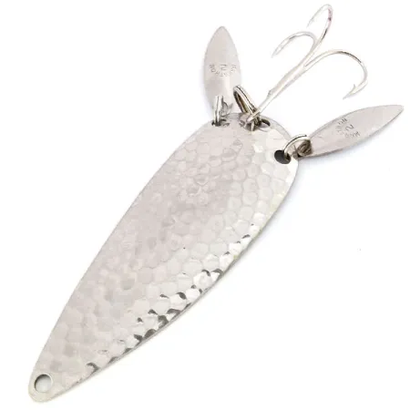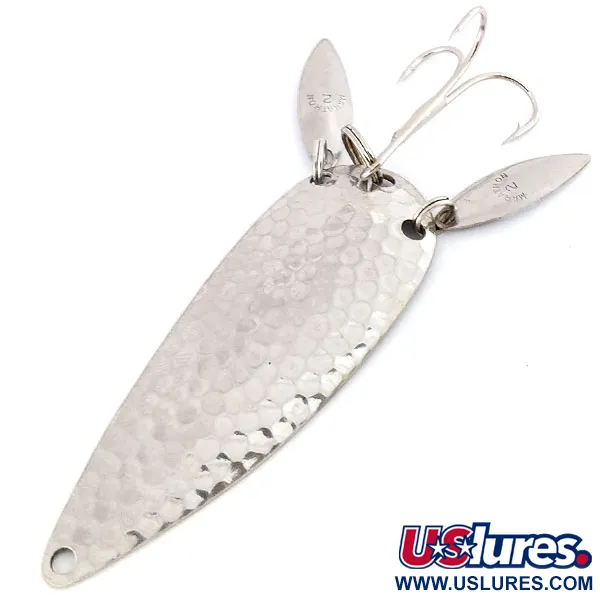 Hamrad nickel ger en tydlig ljusreflekterande yta på detta 14 g (1/2 oz) skeddrag, som tillverkades av Marathon Bait Company under deras femtioåriga verksamhet i Wausau, Wisconsin. Kroppen är 7,5 cm (3") lång och utrustad med två extra "sonic blades" fästa vid den bakre fjäderringen. Dessa små, lövformade metalldelar är utformade för att dölja den stora trekroken och ge extra visuell reflektion som efterliknar stjärtfenors rörelser. Både huvudkroppen och de extra bladen bär det stämplade namnet Marathon, ett karakteristiskt märke för samlare av amerikanska fiskeredskap från mitten av seklet. Detta exemplar, identifierat med produktkod 9579, är i vackert skick med betyget 5/5 och har en ljus och ren finish över den texturerade metallen. Ett fästhål finns i den avsmalnande främre änden för riggning, avsedd för både spinnfiske och trolling.