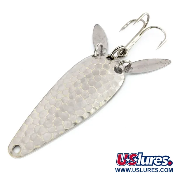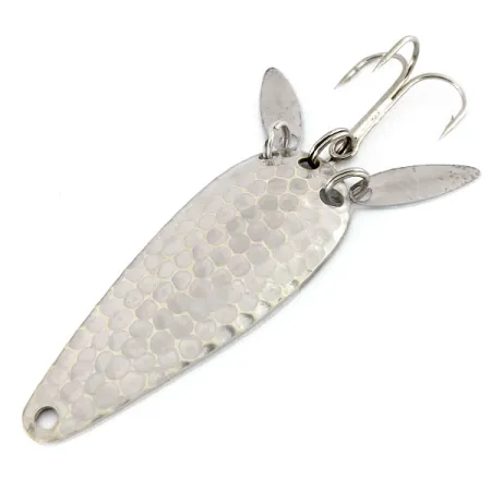 Hamrad nickel ger en mönstrad yta på detta 12g (2/5oz) skeddrag, designat för att fånga och sprida ljus på ett sätt som släta metallytor inte kan. Tillverkad av Marathon Bait Company, som var verksamt i Wisconsin från 1929 till 1979, mäter denna specifika modell 9910 6 cm (2 1/4"). En avgörande teknisk egenskap är paret av små, avlånga ljudblad som är fästa vid fjäderringarna nära stjärten. Dessa blad tjänar ett dubbelt syfte: de maskerar delvis den vassa trekroken och skapar sekundära visuella blixtar avsedda att efterlikna rörelsen hos en betesfisks stjärt. Den konkava sidan har en tydlig "MARATHON"-stämpel som identifierar dess ursprung från en av Mellanvästerns mest produktiva tillverkare av fiskeredskap under mitten av seklet. Detta exemplar är i 5/5 skick och bibehåller en blank, ren finish över både huvudkroppen och tillbehören. Dropprofilen och viktfördelningen är lämpad för kast- eller trollingtekniker som kräver en metallisk silhuett.
