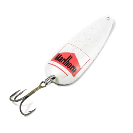 En klassisk profil på 7 cm definierar detta stansade skeddrag i metall, som fungerar som ett unikt samlarobjekt inom fiske med tobaksanknytning. Ursprungligen tillverkad i USA, bär detta föremål produktkod 1964 och uppvisar en vit pärlemorfinish på den konvexa sidan som domineras av den ikoniska röda Marlboro-logotypen. På baksidan finns en kontrasterande förnickling som ger det nödvändiga blänket som förväntas av ett traditionellt skeddrag. Med en vikt på 16 g är den tillräckligt solid för olika kast- eller trollingapplikationer. Hårdvaran inkluderar en trekrok i vintagestil fäst med en robust fjäderring i stjärten. Betet är i 3/5-skick och visar autentiskt slitage på färg och metall som belyser dess historia vid vattnet. En fästpunkt i fören möjliggör enkel riggning på lina eller tafs.