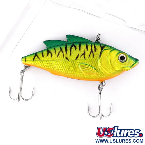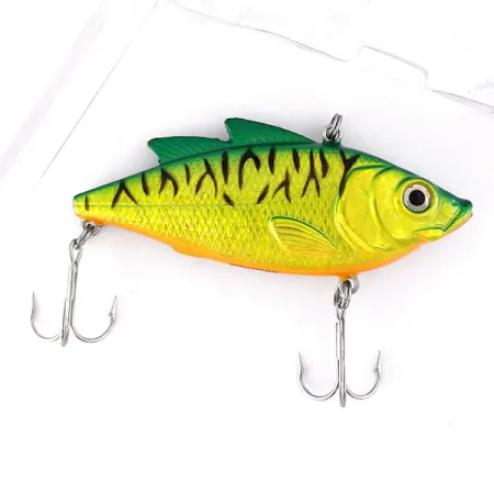 Guldfärgade sidor som övergår i en levande grön rygg definierar Fire Tiger-estetiken på detta Matzuo Lipless UV vibrationsbete. Med en längd på 7,5 cm (3") bär detta exemplar produktkod 10502 och har en specialiserad UV-reaktiv finish för att förbättra synligheten vid svagt ljus eller i grumligt vatten. Betet är sjunkande, vilket möjliggör ett variabelt simdjup beroende på invevningshastighet och linans tjocklek. Dess vikt på 14 g (1/2 oz) ger den nödvändiga ballasten för distanskast på djupt vatten eller trolling efter rovfiskar som gädda, gös och abborre. Två trekrokar är fästa via kraftiga fjäderringar på mage och stjärt, vilket matchar den tåliga konstruktion som förväntas vid fiske efter lax eller öring. Detta specifika bete är i oanvänt skick och har kvar sin fabriksfinish över de strukturerade fjällen och den klarorangea magen. Designad som en ljudproducerande lipless crankbait, ger det interna rasselkammarsystemet en auditiv närvaro medan det stora, realistiska ögat fungerar som en tydlig huggpunkt.