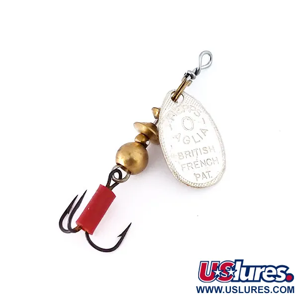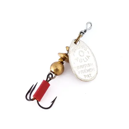 Präglingen på silverbladet avslöjar de ursprungliga märkningarna "British French Pat." och "Aglia", en direkt koppling till Andre Meulnarts uppfinning från 1938. Detta exemplar i storlek 0 väger 2,5 g (3/32 oz) och mäter 4,5 cm (1 3/4"), vilket gör det till ett utmärkt val för ultralätt fiske. På baksidan är skeden tydligt märkt "Made in France", medan spinnaren monterades i USA. Kroppen består av en stapel mässingspärlor och en viktad bas som ger stabilitet åt det bygelmonterade rotationssystemet. En märkbar detalj är trekroken, som är utrustad med en distinkt röd plastslang utformad för att fungera som en visuell huggpunkt för öring eller abborre. I skick 5/5 är silverfinishen exceptionellt blank och mässingsdetaljerna är rena, vilket visar att den har förvarats omsorgsfullt. Trådaxeln är tätt lindad vid öglan, vilket visar på den hållbara konstruktion som förväntas av produktkod 10339. Det breda bladet är konstruerat för att rotera omedelbart vid invevning, vilket skapar det mekaniska motstånd som krävs för att spinnaren ska fungera på olika vattendjup.