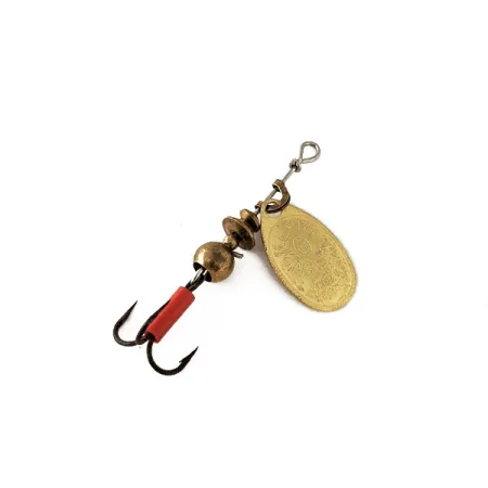 Denna klassiska spinnare mäter exakt 4 cm från öglan till krokböjen och visar precisionen i sina fransktillverkade komponenter. Mepps-entusiaster kommer att uppskatta den blanka guldfinishen på skeden på denna modell i storlek 0, ett färgval som går tillbaka till Andre Meulnarts originaldesign från 1938 avsedd för tydliga reflexer. Kroppen består av stegade mässingspärlor och en central sfärisk vikt, som leder ner till en vass trekrok accentuerad av en röd signaturslang. Med ett skickbetyg på 5/5 ser betet exceptionellt välskött ut med all hårdvara intakt. Detta specifika exemplar, identifierat med produktkod 11120, väger 2,5 g och monterades i USA med originaldelar från Frankrike. Trådaxeln är rak och stöder den konformade bygeln som gör att skeden kan rotera fritt runt den centrala axeln.