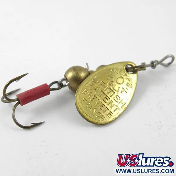 I mässingsskeden är markeringarna "AGLIA" och "BRITISH PATENT" tydligt stämplade, vilket indikerar det historiska europeiska ursprunget för denna spinnare i storlek 0. Betet, som har produktkod 1141, väger smidiga 1/16 oz (2,2 g) och har en total längd på 1 1/2" (4 cm). Detta exemplar har en klassisk mässingsfinish på både skeden och de viktade pärlorna längs den centrala trådkroppen. En klarröd slang är monterad över trekrokens skaft, ett designval som syftar till att fokusera fiskens uppmärksamhet på den vassa änden. Komponenterna tillverkades i Frankrike, vilket framgår av stämplarna "BREVETE" och "MADE IN FRANCE", även om slutmonteringen skedde i USA. Betet har skicket 5/5, är oanvänt och i nyskick för antingen samlarhyllan eller fiskevästen. Skeden är fäst via en enkel mässingsbygel, konstruerad för att rotera fritt runt axeln vid jämn invevning.