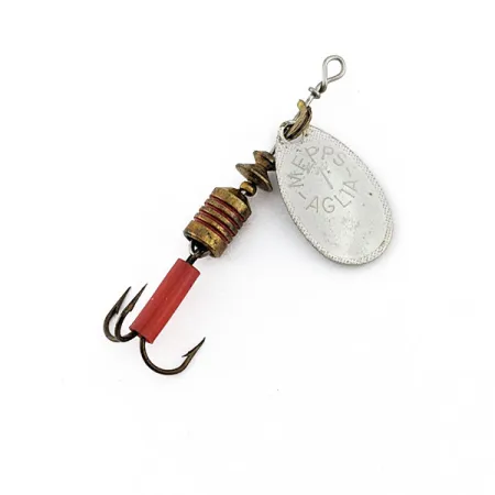 Stämpeln på baksidan av skeden visar tydligt "MADE IN FRANCE", en blinkning till Andre Meulnarts design från 1938. Denna Mepps Aglia 1, med produktkod 22331, har en silverpläterad sked som ger kraftiga ljusreflexer. Med en vikt på 3,5 g och en totallängd på 5,5 cm är den i en mångsidig storlek för fiske efter öring eller abborre. Mässingskroppen är prydd med horisontella röda ränder, vilket ger en diskret kontrast mot metalldelarna. På trekroken sitter en karakteristisk röd plastslang, en vanlig detalj för att locka till hugg. Detta exemplar får skicket 5/5, då silverfinishen och komponenterna är mycket välbevarade och rena.