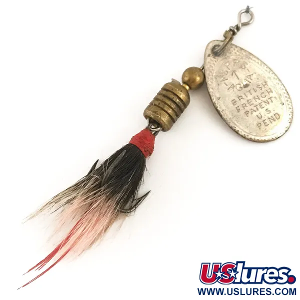 Det silverfärgade skedbladet på denna vintage-spinnare har en tydlig stämpel med "Made in France" på baksidan, vilket speglar det hantverk från mitten av seklet som är synonymt med Mepps arv. Aglia storlek 1 väger 3,5 g (1/8 oz) och är 5,1 cm (2") lång. Den har en räfflad kropp i massiv mässing och en pärla som underlättar smidig rotation runt axeln. Just detta exemplar, märkt med produktkod 4723, har en handbunden trekrok med naturligt hår i svarta och vita toner och en distinkt röd trådlindning. Skedens framsida är märkt med "British French Patent U.S. Pend", en detalj som daterar spinnaren till 1960-talet när komponenter importerades för montering i USA. En liten, autentisk buckla finns på silverskeden, vilket är konsekvent med historiken för ett drag i 4/5-skick. Konstruktionen bygger på ett konrotationssystem som får skeden att spinna omedelbart vid kontakt med vattnet, oavsett ström eller invevningshastighet.