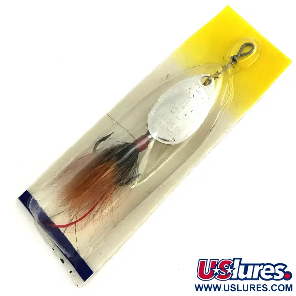 Ett försilvrat skedblad karaktäriserar denna 3,5 g (1/8 oz) spinnare, en stapelvara i Mepps sortiment. Denna Aglia 1 dressed-modell, med produktkod 8678, har en total längd på 6 cm (2 1/4"). Betet är oanvänt och ligger kvar i sin originalförpackning med det gul-vita färgskiftande kortet från Mepps Fishing Guide-eran i Antigo, Wisconsin. Den fjäderklädda kroken består av mörkbruna och svarta fibrer med en tydlig röd markering vid trekrokens bas. Skedbladet har den traditionella stämplingen, en hyllning till Andre Meulnarts franska design från 1938 som senare introducerades i USA. Monteringen består av amerikanska och utländska delar och håller märkets höga kvalitet. Plastbubblan är intakt och skyddar den reflekterande silverfinishen och den handbundna fjäderstjärten.