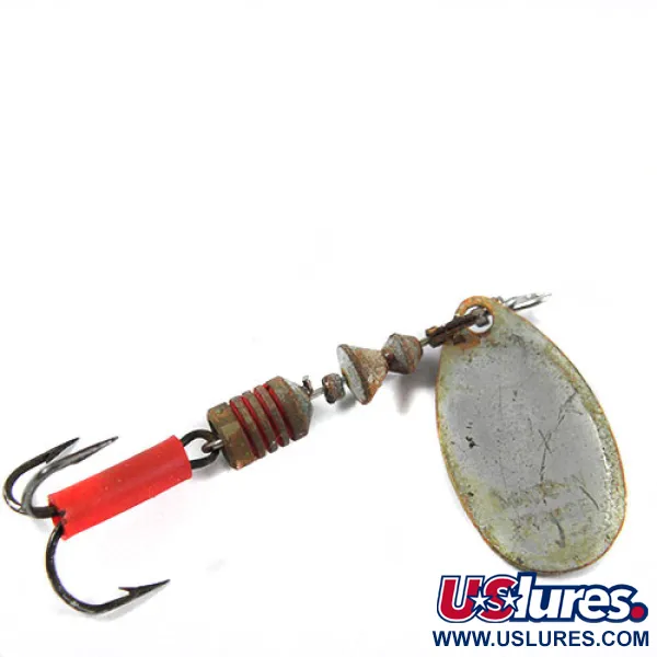 Silver- och vitrandiga mönster pryder skeden i storlek 2 på denna klassiska franska spinnare. Med en vikt på 4,5 g (3/16 oz) och en total längd på 5,5 cm (2 1/4"), är denna Mepps Aglia 2 (produktkod 0350) ett klassiskt inslag i vintage-draglådor. Skedens framsida visar det karaktäristiska röd- och vitrandiga mönstret med det stämplade numret "2" och Mepps-logotypen i röd skrift. Den har ett graderat viktsystem med mässingsfärgade pärlor och en blytonad kon, följt av en trekrok som delvis täcks av en röd plasthylsa. Den visar tecken på lätt användning (skick 4/5) och metallytorna har fått en mattare ton över tid. Bygeln (clevis) är utformad för att underlätta skedens mjuka rotation runt tråaxeln, ett signum för Andre Meulnarts design. Detta exemplar är byggt på en robust trådstomme som avslutas med en standardögla för fiskelinan.