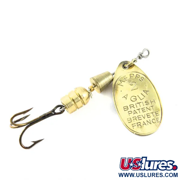 På mässingsskeden finns de tydligt stämplade märkningarna «BRITISH PATENT» och «BREVETE FRANCE», vilket understryker det europeiska arvet hos denna Mepps Aglia 2 (Produktkod 1128). Denna spinnare i storlek 2 mäter 5,5 cm (2 1/4") i längd och väger 4,5 g (3/16 oz). Den använder det klassiska konrotationssystemet som är utformat för att ge omedelbar gång i skeden vid invevning. Mässingskomponenterna har kvar sin lyster, vilket bidrar till dess skickbetyg på 4/5. Även om kärnkomponenterna tillverkades i Frankrike monterades just denna enhet i USA, vilket återspeglar varumärkets expansion efter Andre Meulnarts uppfinning 1938. Den nakna trekroken är fortsatt vass och fäst vid den segmenterade mässingskroppen med en robust trådkonstruktion som avslutas i en prydlig ögla för lina.
