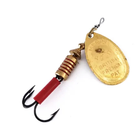 I det guldpläterade skeden är den tydliga märkningen 'British French Pat.' instämplad, en blinkning till det mångåriga internationella arvet hos denna Mepps Aglia 3. Med en vikt på 7g (1/4oz) och en längd på 7cm (2 3/4") har detta specifika exemplar en lysande röd plastslang över trekrokens skaft, vilket ger en tydlig visuell kontrast mot metallen. Baksidan av skeden bär stämplarna 'For Breck's Canada' och 'Made in France', vilket identifierar dess distribution via den kanadensiska importör som hjälpte till att popularisera Andre Meulnarts design från 1938. Kroppen i massiv mässing är detaljerad med djupa horisontella räfflor, vilket ger den nödvändiga vikten för kast samtidigt som den fungerar som fäste för den konformade bygeln. Varje komponent i denna spinnare i 5/5-skick, från mässingsvajern till den polerade guldpläteringen, speglar den hållbara konstruktion som gjorde dessa spinnare till global standard. Denna produktkod 10079 representerar Aglia-designen i mellanstorlek som ofta används för att rikta fisket mot större öring, abborre eller gädda.