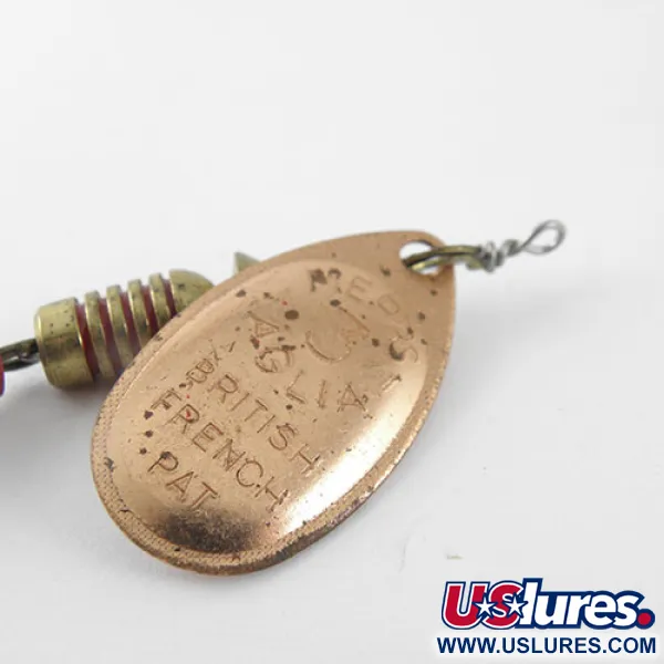 I metallen på det droppformade skeden finns präglingarna "MEPPS AGLIA 3 BRITISH FRENCH PAT.", en direkt länk till de franska rötterna från 1938 i Andre Meulnarts legendariska design. Detta exemplar, med produktkod 1131, väger 1/4 oz (7 g) och är i ett mycket rent skick motsvarande betyget 4/5. Skedens baksida är tydligt märkt "MADE IN FRANCE", vilket markerar den era då dessa specifika komponenter tillverkades utomlands innan de monterades i USA. Betet är 2 1/4" (6 cm) långt och har en viktad mässingskropp med djupa skåror fyllda med rött pigment. Trekroken är utrustad med en tydlig röd plasthylsa som fungerar som en huggpunkt med hög synlighet för jagande fisk. Konstruerad med en specialiserad bygel, är den bronsfärgade skeden designad för att börja rotera i samma ögonblick som den träffar vattnet, vilket skapar de specifika mekaniska vibrationer som gjort denna modell till en favorit för öring- och abborrfiskare i decennier.