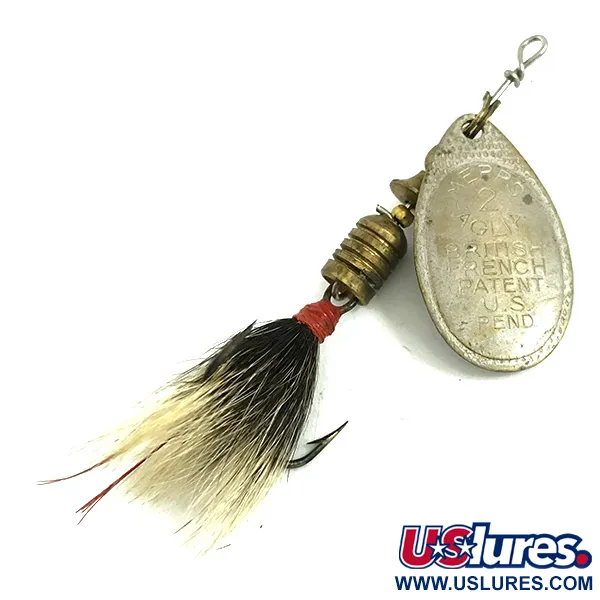 Tydligt präglat i silverbladet finns de ursprungliga franska och amerikanska patentmärkena, vilket identifierar denna Mepps Aglia 3 dressed (produktkod 5830) som ett genuint stycke sportfiskehistoria från mitten av seklet. Med en vikt på 1/4 oz (7,3 g) har detta exemplar det ikoniska breda silverbladet designat för att rotera runt en central axel med mässingspärlor. Spinnaren mäter 6 cm och är färdigställd med en klassisk dressing av naturhår, handbunden med röd tråd och med distinkta mörka accenter. Denna modell representerar den era då komponenter tillverkades i Frankrike och monterades i USA, ett kännetecken för varumärkets expansion under 1950-talet. Mässingskroppen är konstruerad av flera staplade ringar som ger den nödvändiga vikten för kast i olika typer av vatten. Skicket på denna spinnare är utmärkt och förtjänar betyget 5/5 för sina välbevarade metallytor och den intakta dressingen. En enkel trekrok är dold under fibrerna, medan den enkla och robusta bygeln gör att bladet börjar rotera direkt vid kontakt med vattnet.