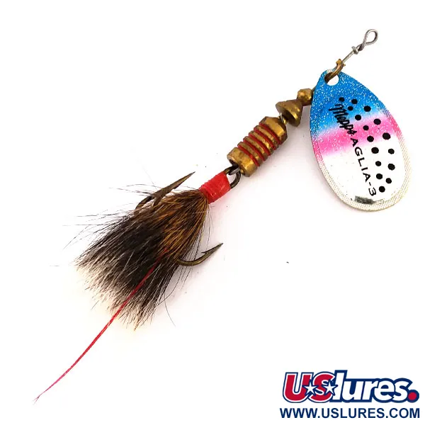Ett livfullt ”Trout”-mönster på skeden, 6 cm lång, definierar denna klassiska Mepps Aglia 3. Skeden har en slående trefärgad gradient i blått, rosa och silver med svarta prickar, en specifik finish avsedd för synlighet i klart vatten. På baksidan av skeden syns den autentiska präglingen ”MEPPS AGLIA MADE IN FRANCE” tillsammans med storleksbeteckningen ”3”, vilket bekräftar kvaliteten på de fransktillverkade komponenterna. Med en vikt på 7,3 g är mässingskroppen monterad med precision på trådachseln, som avslutas med en handbunden ekorrsvans på trekroken. Detta exemplar, med produktkod 9553, är i skick 5/5, där metalldelarna är blanka och accenterna av kalkonfjäder i dressingen är helt intakta. Monterad i USA, bygger designen på ett specialiserat bygelsystem för omedelbar rotation vid kontakt med vattenytan.