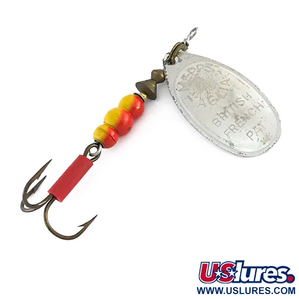 Tydligt präglat i den silverfärgade skeden finns märkena av dess arv, som identifierar detta specifika exemplar som en "British French Pat"-modell. Denna Mepps Aglia 4, katalogiserad under produktkod 8085, mäter 7 cm (2 3/4") och väger 9 g (1/3 oz). Konstruktionen har en sekvens av tre gula och röda pärlor placerade ovanför en trekrok skyddad av ett segment röd slang. Maskinvaran är i 5/5 skick, med en blank finish på skeden och vassa krokspetsar. På baksidan av skeden anger stämpeln "Made in France" komponenternas ursprung, vilka senare monterades för den amerikanska marknaden. De mässingsfärgade distanserna och det konformade rotationssystemet är utformade för att underlätta skedens rörelse i det ögonblick den når vattenytan. Trådaxeln är rak och hela monteringen visar på den noggrannhet som iakttagits vid tillverkningen.