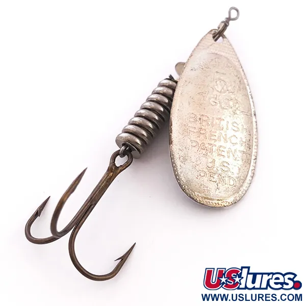 Med en vikt på 1/2 oz (14 g) visar denna vintage-spinnare den tidiga ingenjörskonsten i en design som blev en global standard för sötvattensfiske. Det silverpläterade bladet är djupt stämplat med "BRITISH FRENCH PATENT U.S. PEND", vilket återspeglar det internationella ursprunget för Andre Meulnarts franska uppfinning från 1938 innan den blev populär i USA. Betet mäter 8 cm (3 1/4") i längd och är konstruerat med mässingsfärgade pärlor och en staplad metallkropp som ger den nödvändiga ballasten för kast. Detta specifika exemplar är i 5/5-skick, med välbevarade metallytor och skarpa, läsbara markeringar på det droppformade bladet. Monteringen kompletteras med en robust trekrok, säkert riggad på den centrala tråden som löper från den övre öglan genom de viktade kroppskomponenterna.