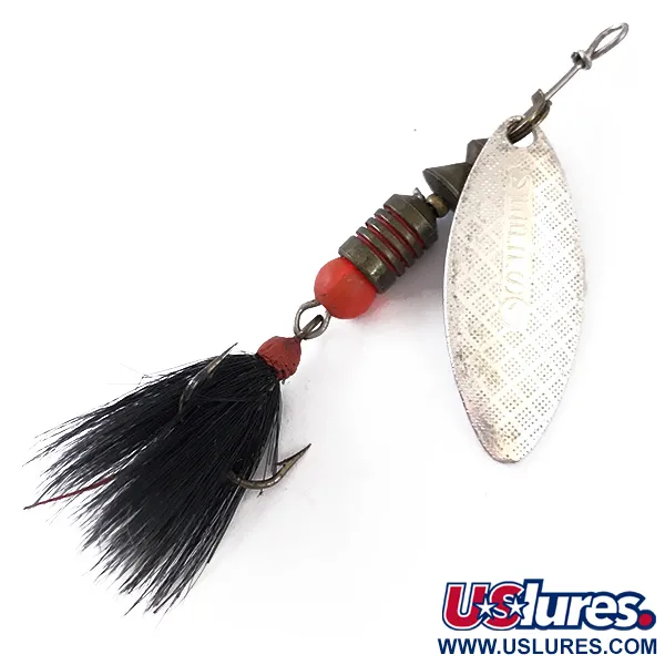 En distinkt diamantmönstrad textur täcker det silverfärgade pilbladsformade skeden, ett kännetecken för Mepps Aglia Long-serien designad för högfrekventa vibrationer i rinnande vatten. Med en vikt på 3/16 oz (4,5 g) och ett mått på 2 1/4" (6 cm), har detta bete i storlek 1 de klassiska fransktillverkade komponenterna monterade i USA. Skeden är tydligt stämplad med tillverkarens namn och dess franska ursprung, vilket ger ett högkontrast-blixt mot silverfinishen. Bakom byglen består den tyngda kroppen av mässingsfärgade segment separerade av ljusröd färg, vilket leder ner till en enskild röd pärla. Terminaländen är utrustad med en trekrok klädd i tjocka, handknutna svarta fjädrar som ger en betydande profil. Tilldelad produktkod 4834, förblir betet i 5/5 skick, med välbevarad hårdvara och rena, levande färger på kroppssegmenten. Den smala skeddesignen är speciellt konstruerad för att stanna djupt i vattenpelaren även mot starka strömmar.