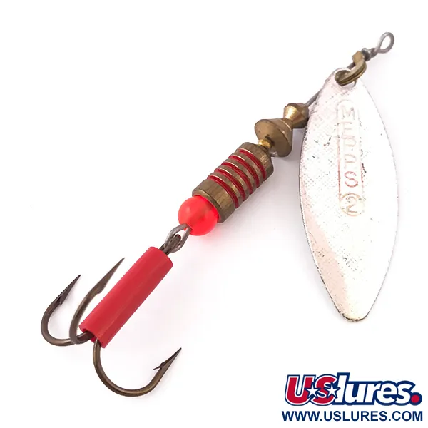 En vikt på 1/4oz (7,4g) är fördelad över en räfflad mässingskropp, där djupröda färgaccenter i skårorna ger visuell kontrast. Denna Mepps Aglia Long 2 mäter 2 3/4" (7cm) från linknuten till krokböjen och består av högkvalitativa komponenter tillverkade i Frankrike och monterade i USA. Det långsmala pilbladsformade skeden är utförd i blank nickel och har en tydlig stämpel som identifierar ursprung och modellstorlek. Samlare som dokumenterar produktkod 3981 kommer att uppskatta att originaldelarna är bevarade, inklusive den genomskinliga röda pärlan ovanför krokögat. Detta exemplar är i 5/5 skick, med rena metallytor och en rak genomgående tråd. Trekroken i bronsfinish är fabrikssvass och utrustad med en klassisk röd attraktor-slang på skaftet.