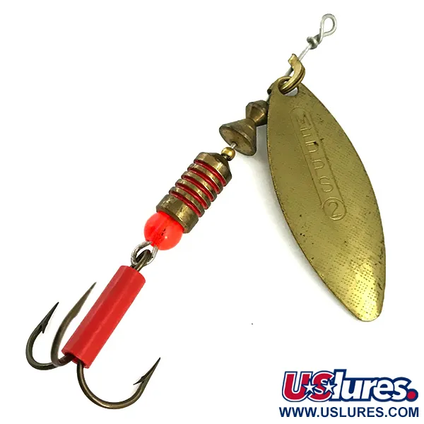 Tydligt präglat på den guldiga pilbladsskeden står orden "AGLIA LONG G MADE IN FRANCE", vilket markerar det europeiska ursprunget för denna klassiska spinnare. Denna Mepps Aglia Long 2, identifierad med produktkod 5703, väger 7,4 g (1/4 oz) och mäter 7 cm (2 3/4") i total längd. Samlare kommer att uppskatta de livfulla röda accenterna, inklusive den räfflade färgen på mässingskroppen, en enskild röd pärla och ett distinkt rött hölje som skyddar trekrokens skaft. Även om komponenterna tillverkades i Frankrike, monterades just detta exemplar i USA. Skedens smala profil är tekniskt utformad för att bibehålla en snäv rotation även i stark ström eller på större djup, vilket ger en annan visuell profil än den runda standardskeden på Aglia. I nyskick (5/5) är guldytan på skeden fortfarande blank och märkningarna är skarpa och läsbara.