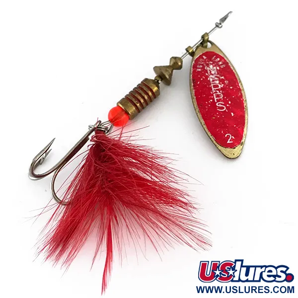 En livlig tofs av röda fjädrar pryder trekroken på detta exemplar och markerar det som en klassisk fjädervariant av en legendarisk spinnardesign. Videblads-skeden, karaktäristisk för Long-serien, har en djupröd framsida stämplad med storlek 2, medan den guldfärgade baksidan stolt visar märkningen "Made in France". Med en vikt på 7,3 g (1/4 oz) och en längd på 7 cm (2 3/4"), är dragets arkitektur uppbyggd kring en robust trådstomme. Denna stomme bär en serie mässingskomponenter, inklusive en distinkt räfflad vikt och ribbade cylindrar, följt av en orange pärla med hög synlighet. Dessa metallkomponenter och skedens målade yta är exceptionellt välbevarade och förtjänar betyget 5/5. Katalogiserad som produktkod 8258, monterades denna spinnare i USA med dessa franska komponenter av hög kvalitet. Kombinationen av den guldskimrande mässingen och de röda accenterna ger en högkontrastprofil som framhäver hantverket i originaldelarna.