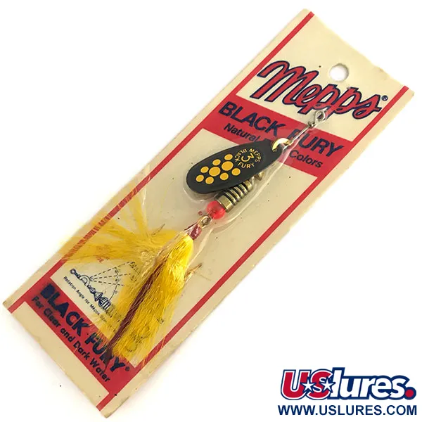 Museiarkiv: Mepps Black Fury 3 Dressed Spinnare, Svart / Gul, 7,3g, Fjäder, #8677