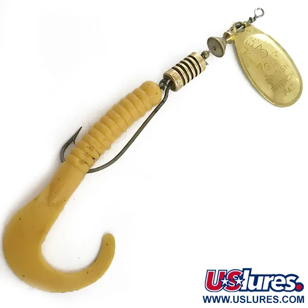 Guldpläterade komponenter, inklusive ett spinnarblad av typen willow (pilblad) stämplat "MADE IN FRANCE", definierar denna Mepps Combo Killer 3. Med en vikt på 8,5 g (1/3 oz) och en längd på 8 cm (3 1/4") visar detta exemplar samarbetet mellan fransk ingenjörskonst och amerikansk montering. Den räfflade mässingskroppen ger kastvikten, parad med en livlig gul curly tail-silikontrailer monterad på en enkelkrok. Autentiska märkningar på bladet, inklusive "BRITISH FRENCH PAT" och "MEPPS GLO", indikerar dess produktionsbakgrund. Med betyget 5/5 framstår betet som exceptionellt välvårdat, där guldpläteringen behåller sin lyster och den mjuka plasttrailern förblir flexibel. Just denna 5904-modell kombinerar en traditionell spinnarprofil med en vasskyddad mjukplasttrailer för mångsidighet i olika vattenförhållanden. Monteringen återspeglar övergångsperioden då fransktillverkade komponenter färdigställdes för den nordamerikanska marknaden.