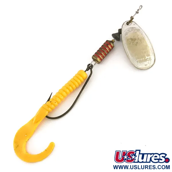 Mepps Combo Killer 4 är monterad i USA med precisionskomponenter tillverkade i Frankrike och har en klassisk silversked stämplad med märkets ikoniska logotyp. Detta 10 cm hybridbete kombinerar en traditionell inline-spinnarkropp med en vasskyddad gul jigg med curlytail, vilket ger en tydlig profil för olika sötvattensmiljöer. Betet väger 10 g (1/3 oz) och har en segmenterad mässingskropp med horisontella rödmålade skåror som sitter säkert på trådachseln. Detta exemplar, med produktkod 7626, är i skick 4/5 och uppvisar välbevarad silverplätering på skeden och en mjuk, livlig trailer. Offsetkroken är vass och korrekt inriktad, vilket säkerställer att betet går stabilt i vattnet vid utkast och hemvevning.