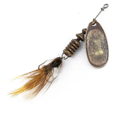 Den mässingsfärgade skeden är tydligt stämplad med den ikoniska texten "3 COMET" och fransk-brittiska patentmarkeringar, vilket speglar varumärket Mepps transatlantiska historia från mitten av förra seklet. Draget väger 6,5 g (1/4 oz) och har en modulär design där den 7 cm långa trådkonstruktionen gör det möjligt att snabbt byta ut den fjäderklädda trekroken. Dessa specifika komponenter tillverkades i Frankrike och monterades senare i USA – en vanlig praxis under 1960-talet som definierade eran för modell 20052. Kroppen i mässing består av en karakteristisk rillad cylinder och en konisk distans, med ett ärligt slitagemönster som ger den skicket 3/5. Kroken är fortfarande prydd med sin ursprungliga fjäderdräkt i brunt och ingefärsrött, vilket ger en naturlig profil i vattnet. Detta exemplar visar den klassiska franska bladgeometrin, utformad för varierande kast och invevning.