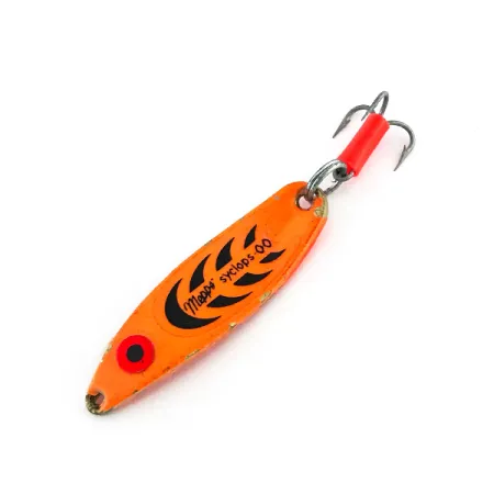 Detta Mepps Syclops 00 UV väger 4,5 g (3/16 oz) och har en distinkt profil designad för långa och exakta kast. Kroppen på 4 cm (1 1/2") är färgsatt i en livlig Fluorescerande Orange, som uppvisar ett starkt gul-orange sken under ultraviolett ljus. Detta USA-tillverkade skeddrag, med produktkod 8727, är märkt med svarta vågliknande mönster och modellnamnet tydligt stämplat på framsidan. Ett vibrerande rött öga med mörk pupill är placerat i framkanten, medan bakänden rymmer en trekrok utrustad med en ljusröd plastslang. Just detta bete är i 5/5-skick och behåller sin ursprungliga högblanka finish och skarpa grafiska detaljer. Den S-formade böjningen på metallkroppen säkerställer stabilitet vid olika invevningshastigheter, oavsett om det används för lätt spinnfiske eller vertikalt jiggfiske.