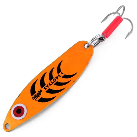 Den böjda kroppen på detta skeddrag är lackerad i en klar orange finish och har svarta markeringar med hög kontrast som övergår i ett specialiserat UV-reaktivt sken för synlighet i djupt eller grumligt vatten. Mepps Syclops 1 (artikelnummer 10305) väger 12 g (2/5 oz) och är 6 cm (2 1/4") lång. Den är i 5/5-skick och framstår som oanvänd. Ett framträdande röd-vitt öga är placerat nära öglan, vilket ger en tydlig siktpunkt för rovfiskar. Utrustningen består av en robust fjäderring och en trekrok klädd med en röd huggslang, en signaturdetalj från Mepps som finns på många av deras USA-tillverkade beten. Tio olika reflekterande ytor är stansade över metallkroppen för att säkerställa att ljuset reflekteras från flera vinklar under invevning.