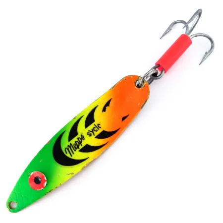 Firetiger-färgerna övergår mjukt från en levande chartreusegrön vid nosen till en djup orange vid stjärten på detta 17g (3/5oz) skeddrag. Metallkroppen mäter 7,5 cm (3") och har en serie svarta revbensliknande accenter samt ett karakteristiskt rött öga. Just denna Mepps Syclops 2 UV, med produktkod 10538, är byggd för synlighet; den UV-reaktiva finishen ger ett skarpt sken på djupare vatten eller under mulna förhållanden. Trekroken är utrustad med en röd huggmarkör (strike indicator), en klassisk fransk detalj från tillverkaren. Skicket är en stabil 4/5, där färg och markeringar förblir skarpa och tydliga över hela ytan. Varumärket är stämplat snyggt bredvid de svarta halvmåneformerna på skeddragets konvexa sida.