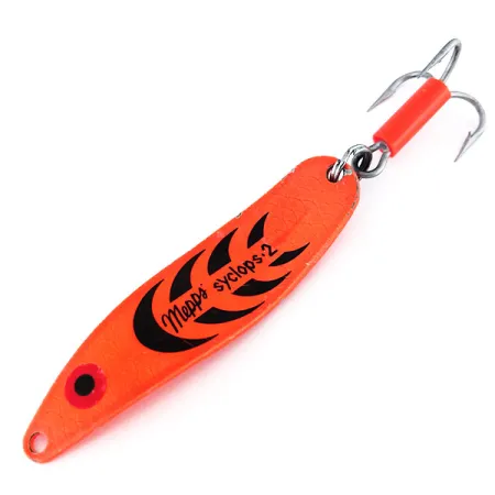 Detta 7,5 cm långa skeddrag i en livlig Orange finish har en design optimerad för synlighet under varierande ljusförhållanden. Kroppen på 17g är stämplad med signaturen "Mepps syclops 2" och pryds av en serie svarta halvmåneformade figurer längs sin längd. Under UV-ljus ger beläggningen ett intensivt röd-orange sken, som visas i mörkfältsfotograferingen, vilket underlättar synligheten i djupare vattenlager. En röd hylsa täcker skaftet på trekroken och ger en subtil huggpunkt bakom huvudkroppen. Finishen och detaljerna på detta exemplar, katalogiserat som produktkod 9787, är i 5/5-skick och behåller originalglansen från fabriksfärgen och de skarpa detaljerna i det svart-röda ögat.