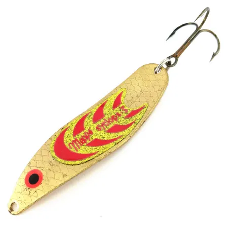 Med en vikt på 26g (1oz) är detta ett rejält skeddrag byggt för långa kast och djupfiske. Den guldfärgade kroppen har ett pressat fjällmönster som reflekterar ljus längs dess 9cm (3 1/2") längd. Denna Mepps Syclops 3, med produktkod 9642, är ett klassiskt exempel på franskdesignad utrustning tillverkad för den amerikanska marknaden. Det livfulla röd-gula mönstret på den konvexa sidan fyller två syften, då det gula pigmentet är fosforescerande för synlighet i djupt eller grumligt vatten. Ett tydligt röd-svart öga nära linögat ger en huggpunkt med hög kontrast. Finishen är fortfarande blank och välbevarad, vilket motsvarar skicket 5/5. Draget är utrustat med en robust trekrok säkrad med en kraftig fjäderring.