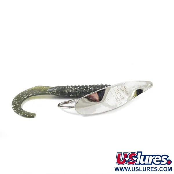Med en vikt på 8g (1/4oz) ger detta vassdrag tillräcklig massa för precisionskast i tät strandnära vegetation. Den polerade nickelfinishen på skeden erbjuder ett klassiskt blänk som reflekterar ljuset effektivt genom vattenpelaren. Denna Mepps Timber Doodle 0, med produktkod 2778, mäter 5cm (2") i längd och levereras med sin ursprungliga mörkt olivgröna jigg-trailer. Trailern är fylld med guld- och silverglitter, vilket ger ett extra visuellt djup. Skeden är särskilt utformad för fiske i tät vegetation och har ett integrerat vasskydd i tråd som skyddar krokspetsen från att fastna i sjunkna träd. Det amerikanska ursprunget är tydligt genom den skarpa stämplingen på baksidan av metallkroppen. Detta exemplar är i utmärkt skick med ett betyg på 4/5 och en mycket välbevarad nickelyta.